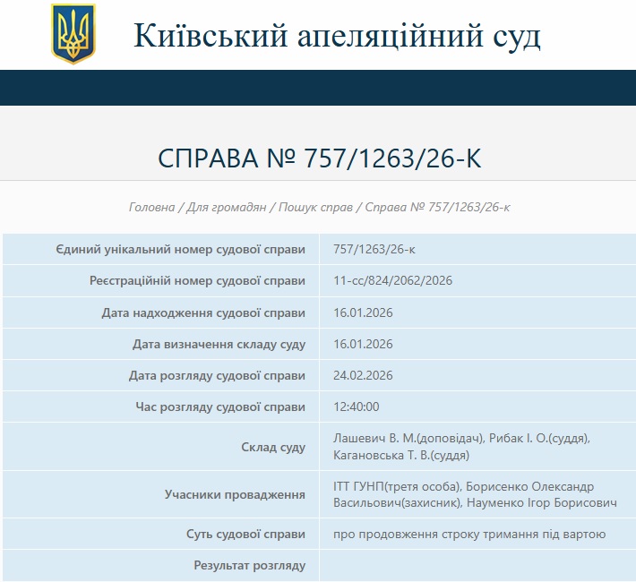 З матеріалів справи випливає: суд відмовив у виведенні процесуального опонента "Наума" зі складу слідчої групи, а окрім цього - продовжив термін безальтернативного тримання під вартою підозрюваного у вимаганні (ч.4 ст.189 КК України) та поширенні злочинного впливу (ч.3 ст.255-1 КК України) до 14 березня включно. Результат розгляду апеляційної скарги щодо "запобіжника" поважного авторитета, який був запланований на 24 лютого, на момент підготовки цього матеріалу офіційно не оприлюднений.