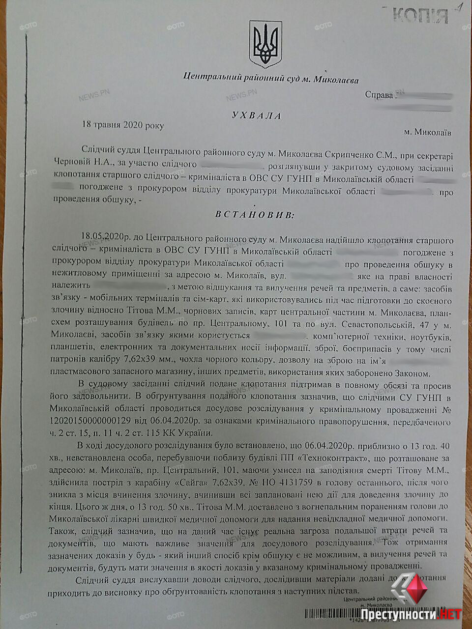 Центральний районний суд Миколаєва скасував арешт, накладений на кілька одиниць мисливської, гладкоствольної, пневматичної та охолощеної зброї, а також радіостанції та понад сотню патронів, які наприкінці травня 2020 року було вилучено правоохоронцями в так званого "положенця" Ігоря Науменка та людей з його найближчого кола оточення під час обшуків, що відбувалися в рамках розслідування кримінального провадження про замах на вбивство "авторитетного бізнесмена" Михайла Тітова на прізвисько "Мультик". Відповідні рішення ухвалили служителі Феміди Сергій Медюк та Галина Подзігун.