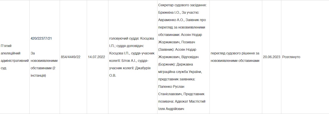 П'ятий апеляційний адміністративний суд зобов'язав Державну міграційну службу України повторно розглянути заяву щодо оформлення документів для вирішення питання про визнання біженцем або особою, яка потребує додаткового захисту 50-річного громадянина РФ Нодари Асояна, який відомий в статусі так званого злодія в законі на прізвисько "Нодар Руставський". Відповідне рішення 20 червня 2023 року постановила колегія служителів Феміди у складі головуючої Ірини Косцової та суддів-учасників - Андрія Бітова і Олександра Джабурія.