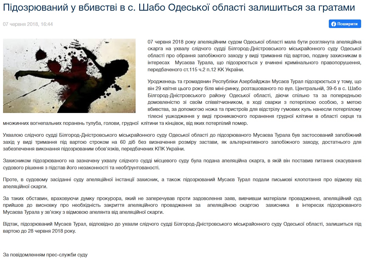 Йдеться про події зразка 28-29 квітня 2018 року, що розпочалися з суперечки в барі "Голівуд" на Білгород-Дністровщині поміж одним із представників азербайджанської спільноти Південної Пальміри та іншим відвідувачем. Останнього на світанку наступної доби викликали на "додаткову розмову" волелюбні сини Кавказу, які прихопили із собою зброю та почали бійку. Під час сутички пролунала серія пострілів в бік "кривдника азербайджанців", а на додачу - його двічі вдарили ножем у груди. Від отриманих поранень чоловік помер у прийомному покої центральної міської лікарні. За підозрою у дотичності до скоєння зухвалого злочину за гарячими слідами було затримано двох співвітчизників - Турала Мусаєва та Орхана Юсіфова.