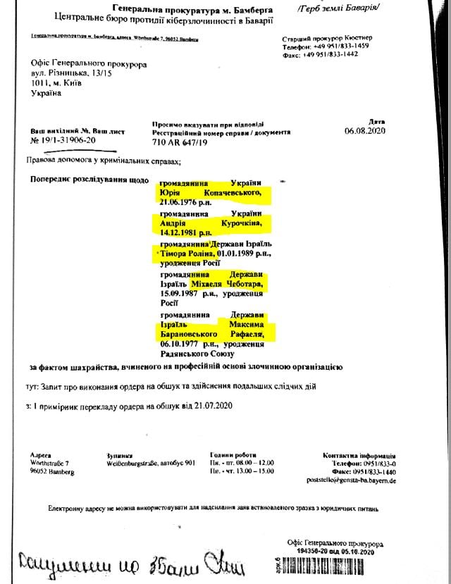 З посиланням на рішення вітчизняних судів та раніше оприлюднені в соцмережах документи (передусім, копію титульної сторінки запиту німецьких правоохоронців) медійники першими в українському інформаційному просторі оприлюднили прізвища групи осіб, яких європейські силовики відпрацьовують на причетність до міжнародої шахрайської оборудки.