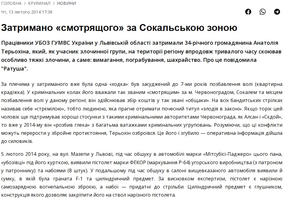 11 грудня 2025 року правоохоронці здійснили затримання за закидами в організації міжрегіонального каналу збуту автоматичної зброї на чорний ринок (ч.1 ст.263 КК України) трьох мешканців Львівщини, включно із 46-річним Анатолієм Терехіним, що позиціонує себе так званим "смотрящим" за містом Червоноград. Про це повідомляє поінформований спвірозмовник Dетектив-Info та підтверджується офіційними повідомленнями правоохоронців і матеріалами судового реєстру.
