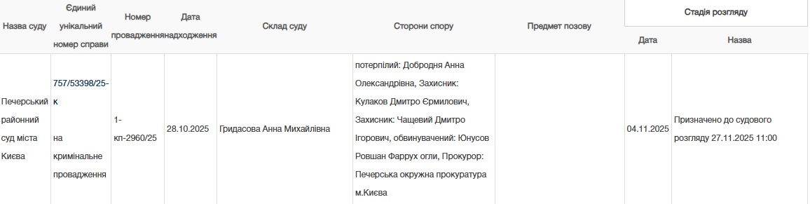 З них випливає: 28 жовтня було здійснено авторозподіл провадження, слухати яке випало судді Анні Гридасовій. В статусі потерпілої особи від дій Юнусова позначено дівчину, що відпочивала в стінах "Nant'у" й активно намагалася розборонити та заспокоїти учасників конфлікту.