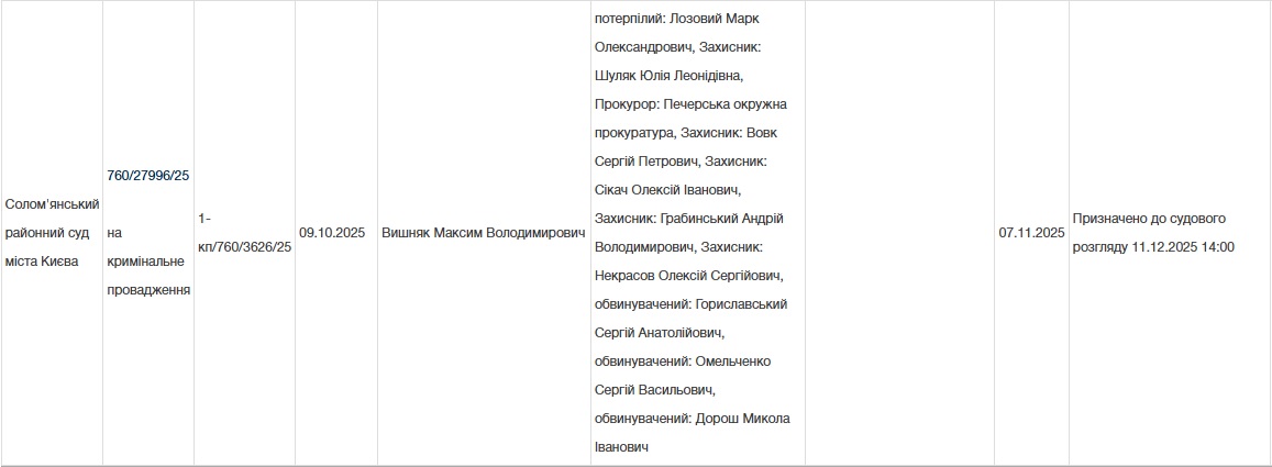 З них випливає: 9 жовтня було здійснено авторозподіл провадження, слухати яке випало служителю Феміди Максиму Вишняку. На лаві підсудних окрім "Носика" перебувають Лілія Гелюх, Владислав Даховський, Сергій Омельченко та Сергій Гориславський.