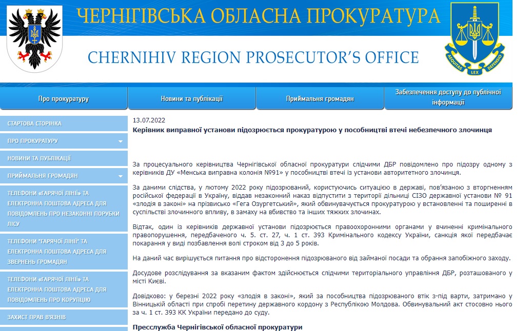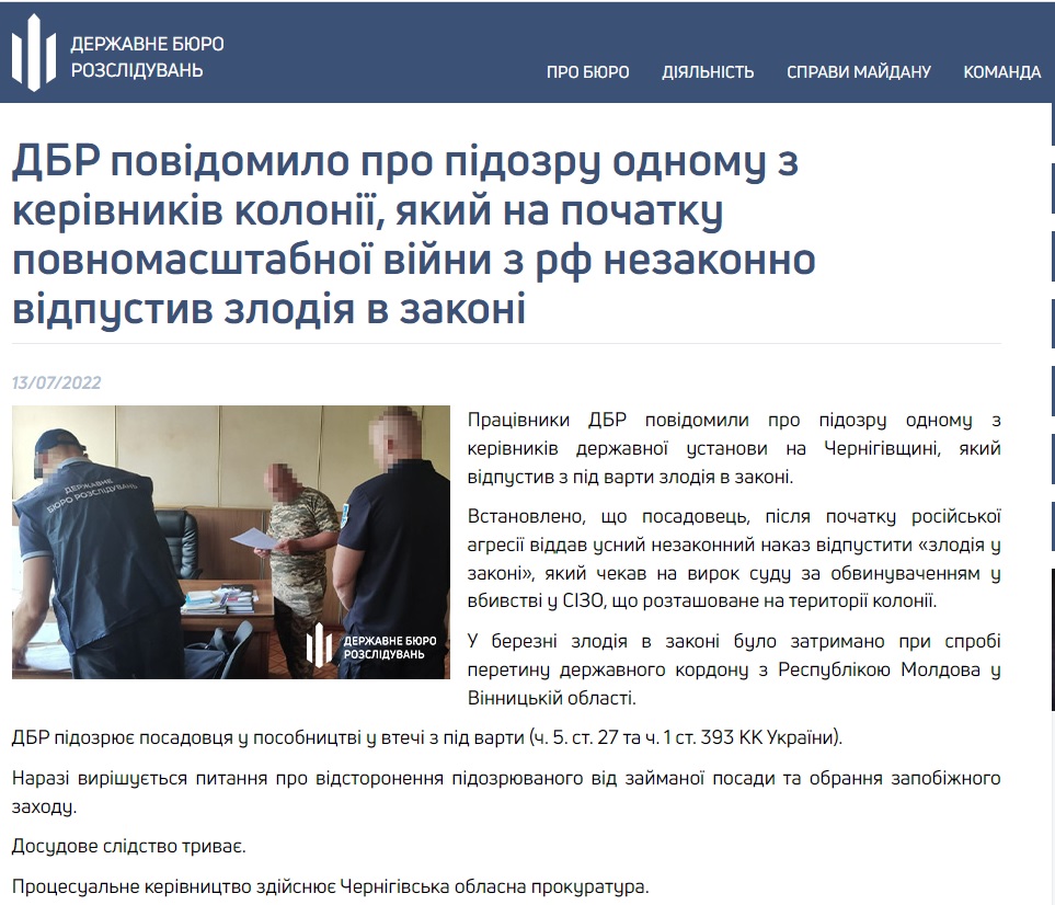 Слідчі Державного бюро розслідувань за процесуального керівництва Чернігівської обласної прокуратури повідомили про підозру одному з керівників ДУ "Менська виправна колонія №91" у пособництві втечі з-під варти із установи (ч.1 ст.393 КК України) авторитетного зловмисника. Про це у середу, 13 липня 2022 року, звітували в регіональній прокуратурі та ДБР.