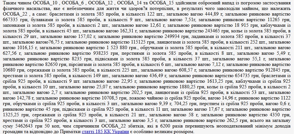 Йдеться про ОЗУ у складі щонайменше п'яти зловмисників, яким закидали дотичність до майже двох десятків епізодів зухвалих пограбувань салонів прикрас, скоєних упродовж 2016-2018 років на території південних та центральних областей України. "Візитівкою" банди виступало використання одягу військового/поліцейського зразку, а найгучнішим епізодом звитяг "нальотчиків" ввважається історія пограбування ювелірної крамниці "Aurum" в херсонському ТРЦ "Фабрика" надвечір 14 травня 2018 року. Тоді здобиччю грабіжників стала понад тисяча прикрас, загальна вартість яких оцінювалася в 5,46 млн. грн.